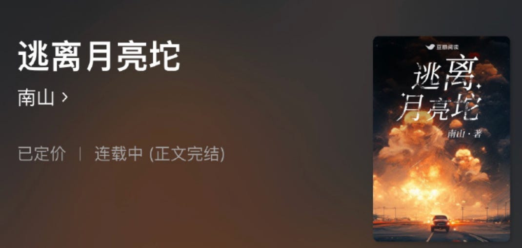 7月8日,豆瓣阅读知名作者南山的悬疑小说《逃离月亮坨》正文完结,随后获得豆瓣长篇拉力赛悬疑组亚军。小说讲述了原本对爱情充满幻想、依附于男人生存的农村女子赵丽云,和城市女性牟敏、女大学生晴晴一起被拐卖到月亮坨后,共同反抗命运的故事。